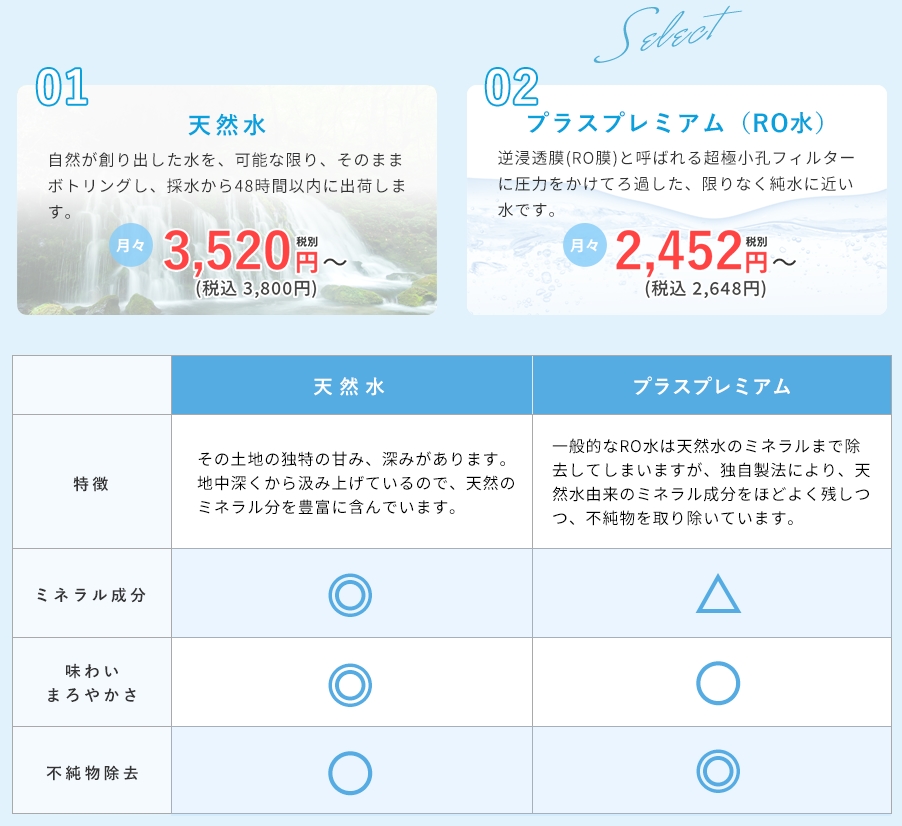 | 天然水の種類 | 4種+RO水 | 1〜2種類が主流 |