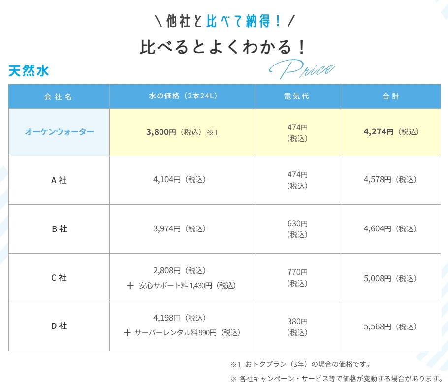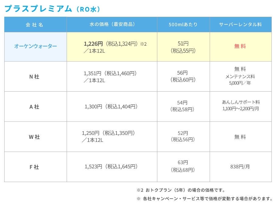 オーケンウォーターは「安いのに高品質」という点でも評価が高く、他社と比較してもコスパが非常に優れています。