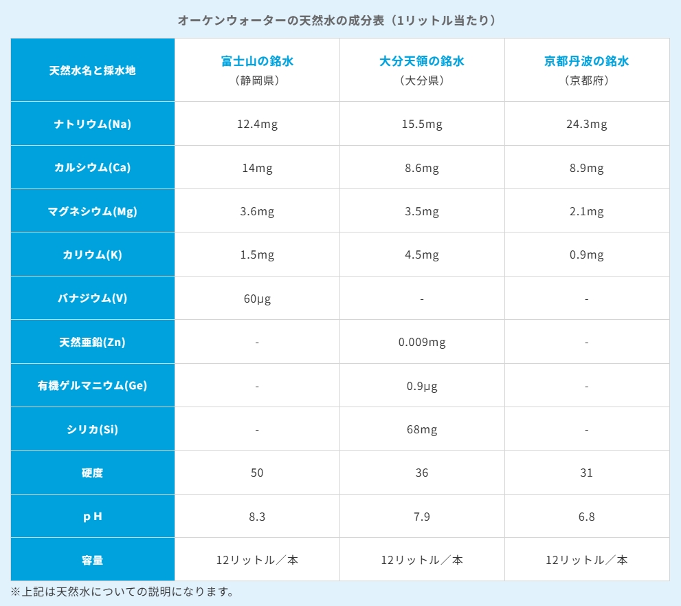 オーケンウォーターでは、4種類の天然水とRO水を用意。飲みやすさや含まれるミネラル成分が異なるため、家族構成や目的に合わせて選べます。